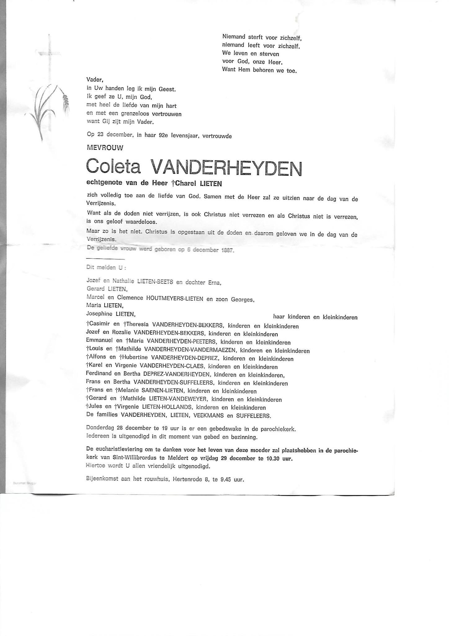In de doodsbrief van Coleta Vanderheyden (dochter van Casimirus) Staat de ganse familie Vanderheyden beschreven met aangetrouwden.