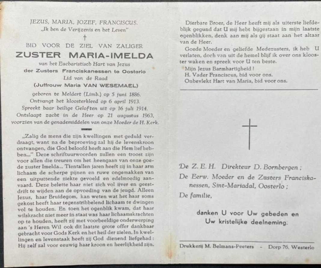 Maria Melania (Imelda) ° 05-06-1886 Meldert + 21-08-1963 Klooster Oosterlo